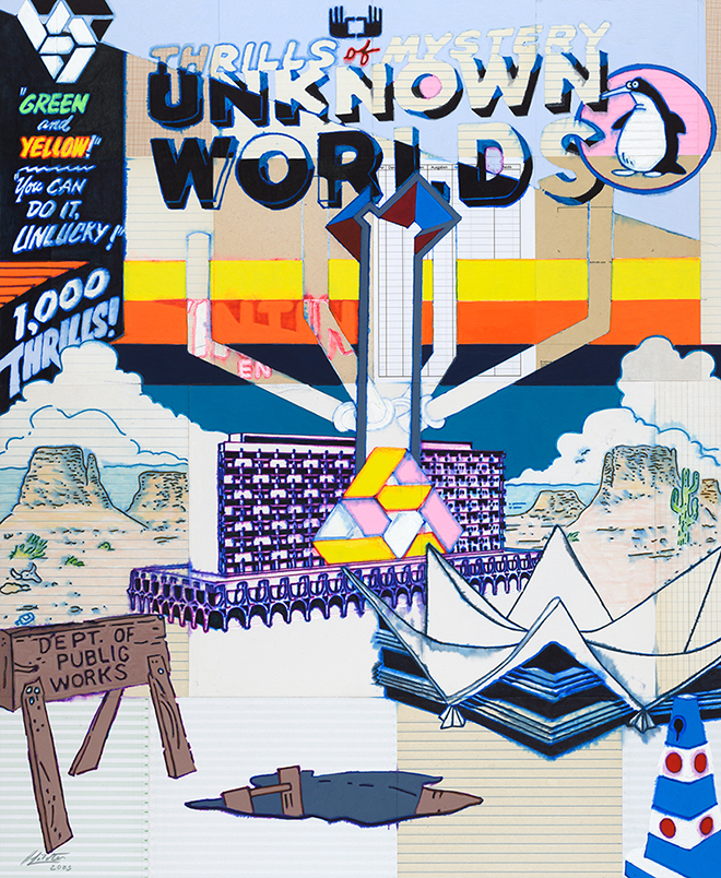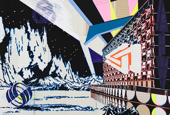 UNKNOWN WORLDS (Rivoli I), 2025, Acryl-Marker, usche, Permanent-Marker auf Papier auf Pappe aufgezogen, 79 x 64 cm